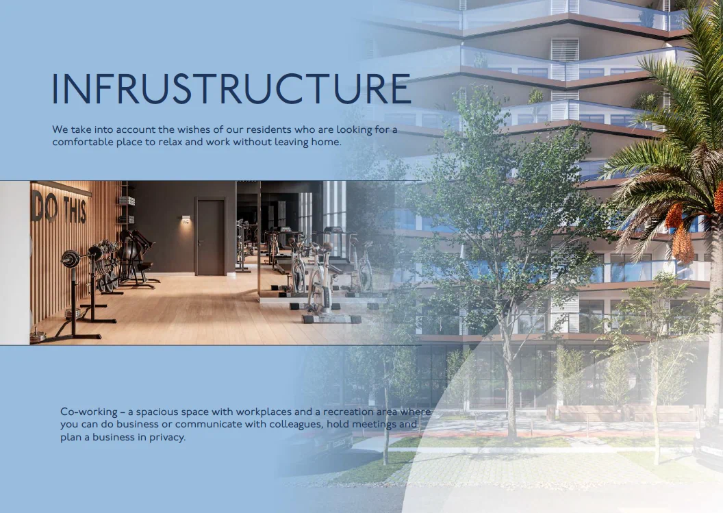 תכנון מתחשב ומודרני של הדירות הוא המפתח לחיים נוחים, לכן הפרויקט תוכנן היטב: חלוקת פנים הדירה בצורה מודרניות, גובה תקרה מ-2.8 מ', זיגוג שקוף של מרפסות, מרווחים עם טרסות ונוף פנורמי להרים ולים.